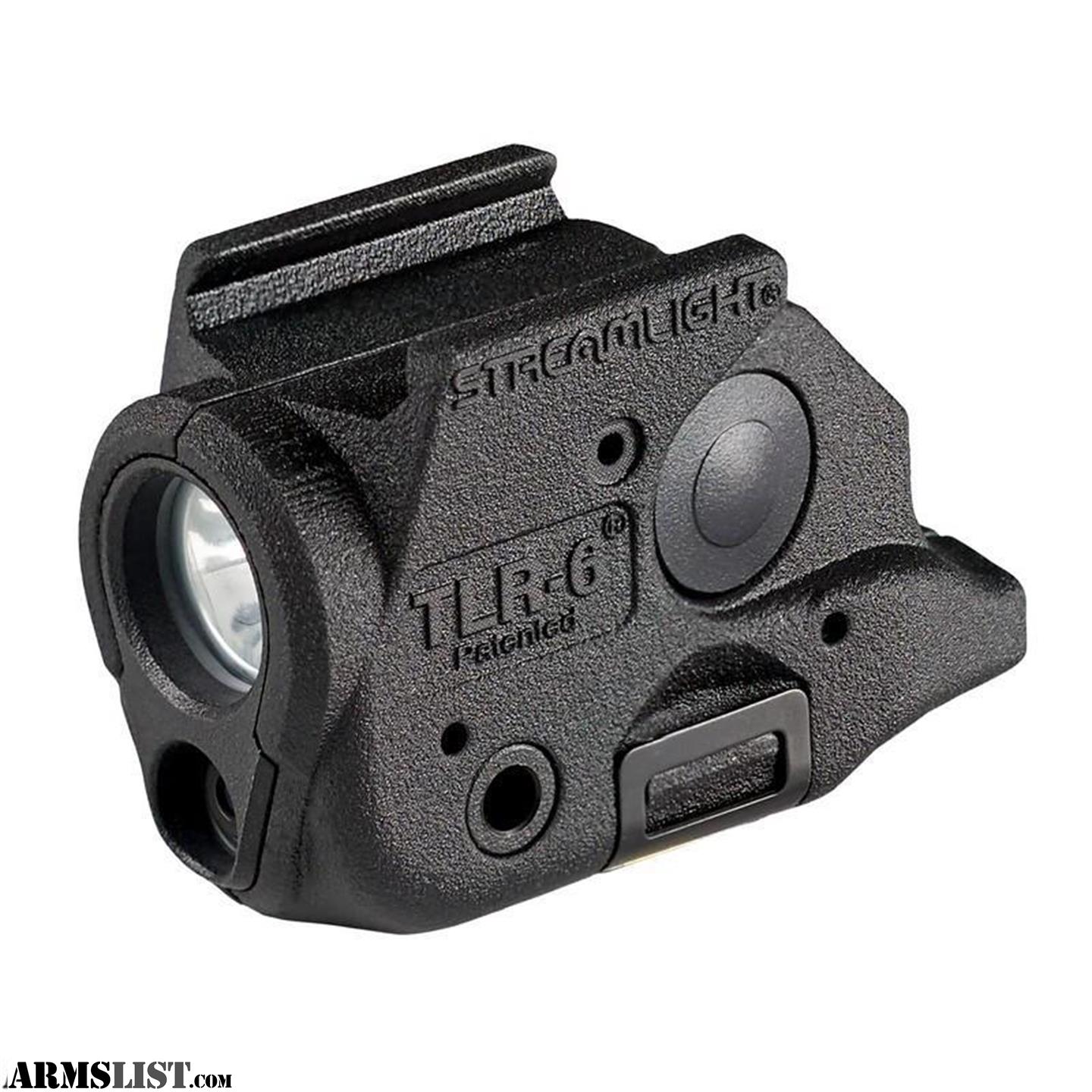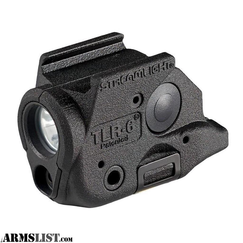 4th Generation: 20, 23, 29, 35 69291 Rail Mount Springfield Armory XD, XD(M), XD MOD.2 69293 Rail Mount M&P M&P Standard and Compact Railed, M&P Shield 2.0 69284 Rail Mount Sig Sauer P365 Sig Sauer P365 69286 Glock 43X/48 MOS and Rail Glock 43X/48 MOS and Rail 69287 SA XD Hellcat SA XD Hellcat Streamlight TLR-6 Tactical Gun Mount Flashlight Features Powered by two (2) CR1/3N lithium batteries which are included C4 LED illumination 640-660nm red laser LED Rating: Up to 2,000 candela peak beam intensity - up to 100 lumens measured system output - 89 meter beam distance Run Time: 1 hour -LED only or LED and laser and 11 hours laser only. 10 minutes auto shut-off on all modes to conserve batteries Windage and elevation adjustment screw mounted in brass bushing for dependable zero retention of laser Three modes - laser only, laser and LED or LED only accessed by push-button on both sides Change batteries while light is still attached to gun Removable cover for easy attachment / removal Impact-resistant polymer construction IPX4 water resistant Serialized for positive id Withstands heat and cold with operating temperatures of -20 deg F to +120 deg F Length: 2.30" - 2.97" (depending on model) Width: 0.85" Height: 1.42" Weight: 1.12 oz - 1.27 oz (depending on model) Assembled in the USA Streamlight 69270 69271 69272 69273 69274 69275 69276 69277 69278 69290 69291 69293 69284 69286 69287 Streamlight TLR-6 Tactical Flashlight with Laser Sight has a Limited Lifetime Warranty against defects.