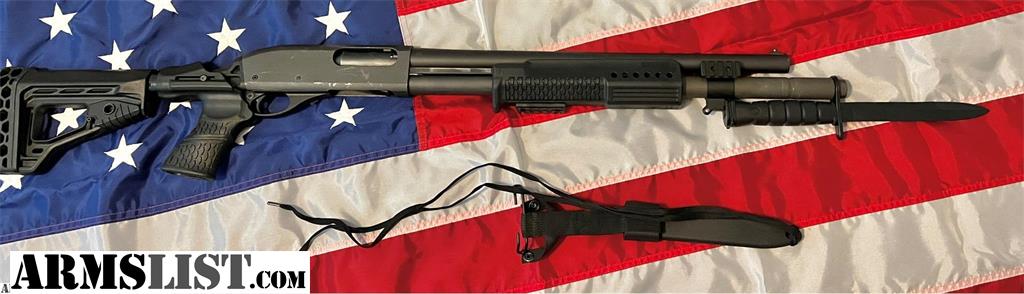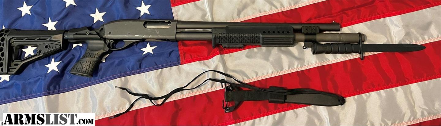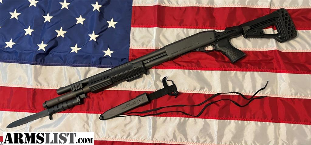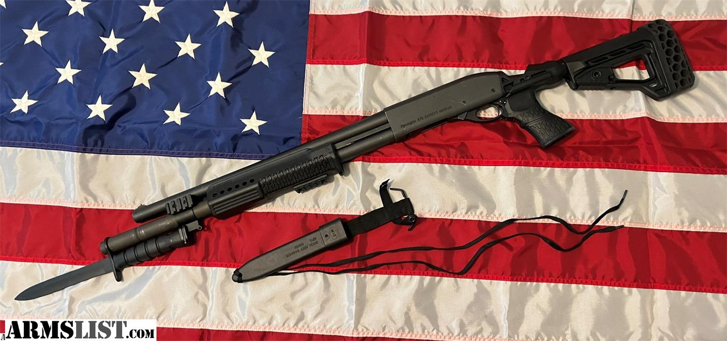 Nice Remington 870 Magnum 12 gauge shotgun. Holds (7+1) 2 and 3/4 inch shells. Will also hold 3 inch shells. 18 inch barrel. Comes with Knoxx Tactical recoil reducing stock set. Rear stock is collapsible. Also comes with UAE contract overrun M10 bayonet that affixes to the bayonet lug, making this shotgun a formidable adversary. The magazine tube extension is factory Remington steel. There are various mounting points located on the firearm and the magazine tube. Comes with Unopened Winchester Ranger 12 gauge 2-3/4 reduced recoil rifled slug ammo. 250 rounds in case in boxes of 5. Thanks for looking!