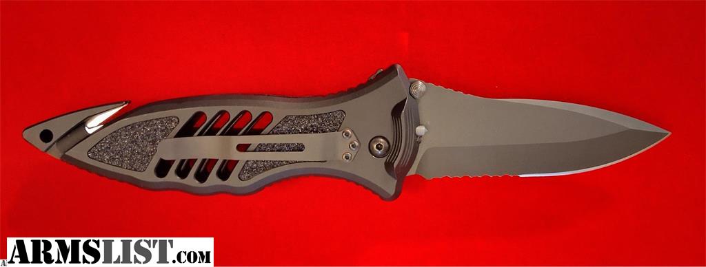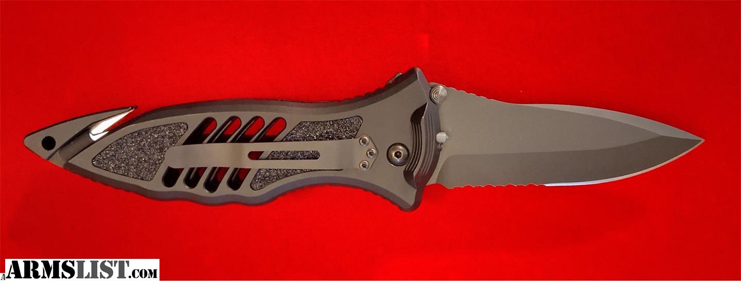 Blade Material: Premium 154CM high-carbon stainless steel (60 Rockwell hardness) with a DLC black non-reflective coating. Blade Style: Modified spear point with Partially Serrated edge. Deployment: Rapid push-button automatic action with a secondary safety slide lock to prevent accidental firing. Handle: Fully 3-D machined T-6 aircraft aluminum with "Wingwalk" non-slip grip tape inserts for superior control in all conditions. Integrated Rescue Tools: Built-in double razor blade seatbelt/cord cutter, a carbide glass breaker, and a detachable C4 punch reversible with pocket clip. Carry: Reversible stainless steel pocket clip (tip-down) and lanyard hole. Origin: Made in the USA. Condition