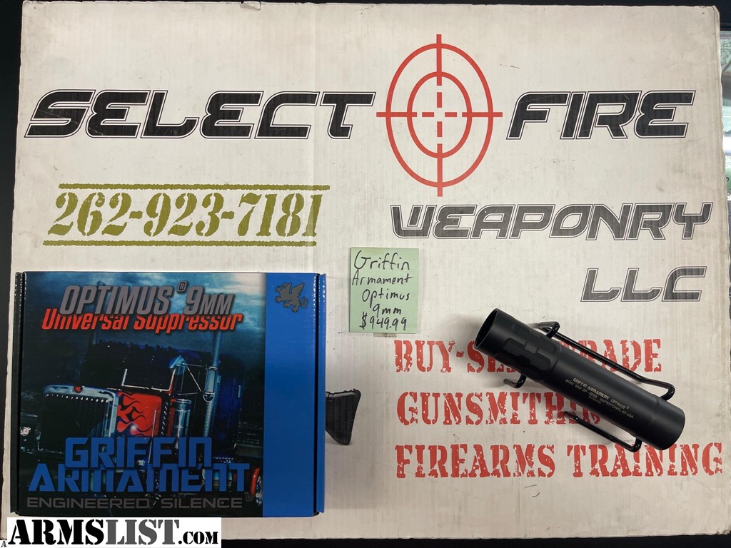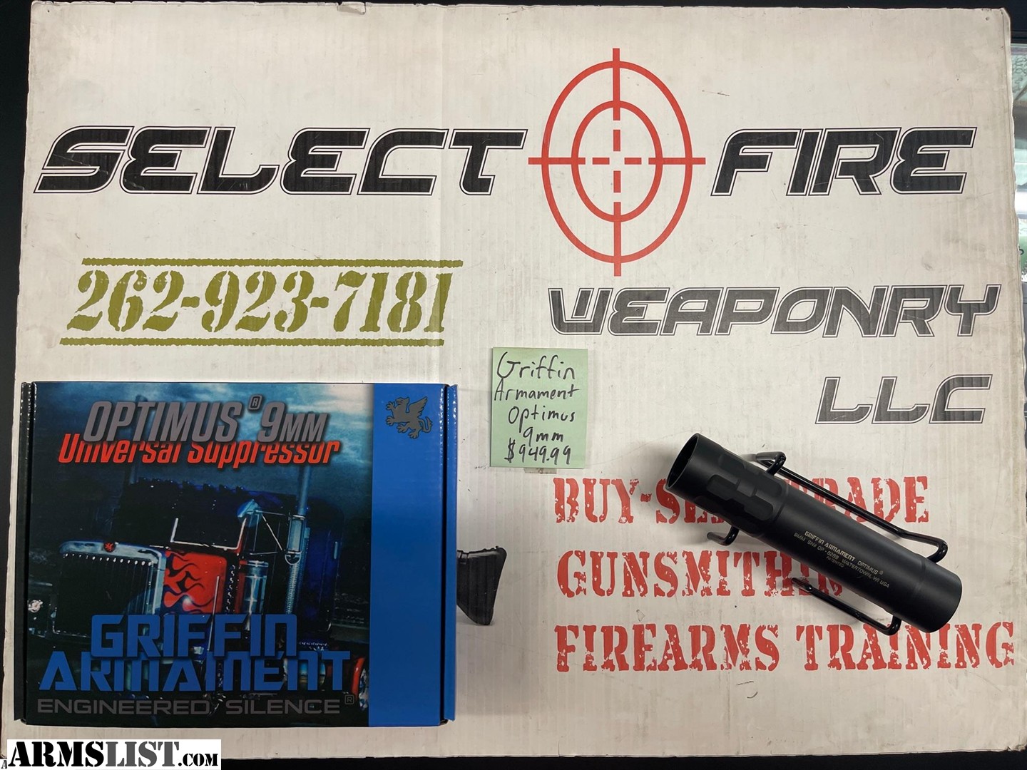 We have for sale a brand new in box Griffin Armament Optimus 9mm silencer! This is in stock and available for in store purchase today! Or if you are out of state, we can ship for $29.99! This will transfer tax free to your dealer on an efiled form 3. Once at your dealer you are responsible for completing the form 4 process, paying the tax stamp and any associated transfer fees.