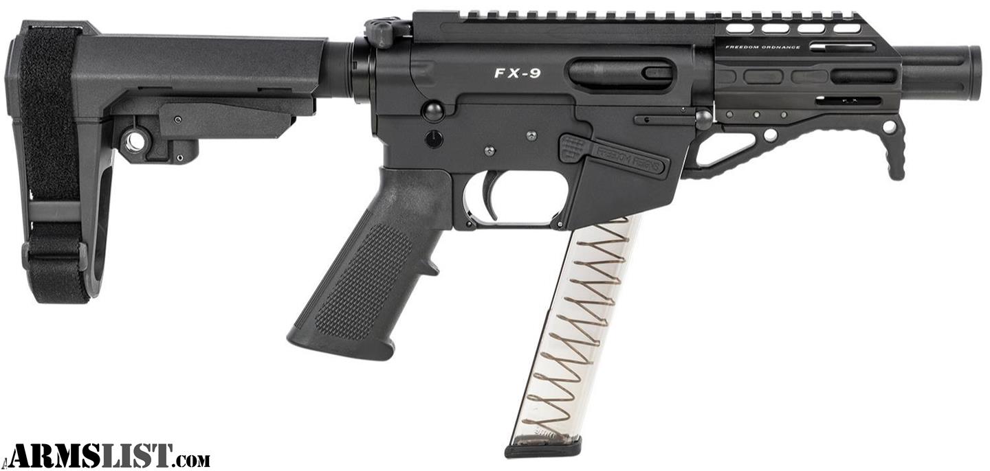 The FX-9 pistol line is available with the SB Tactical SBA3 pistol brace installed from the factory. Featuring a 4" barrel, faux suppressor and the proprietary Freedom Ordnance Angled Fore Grip, the FX-9 pistol is built to perform. Glock mag compatible.