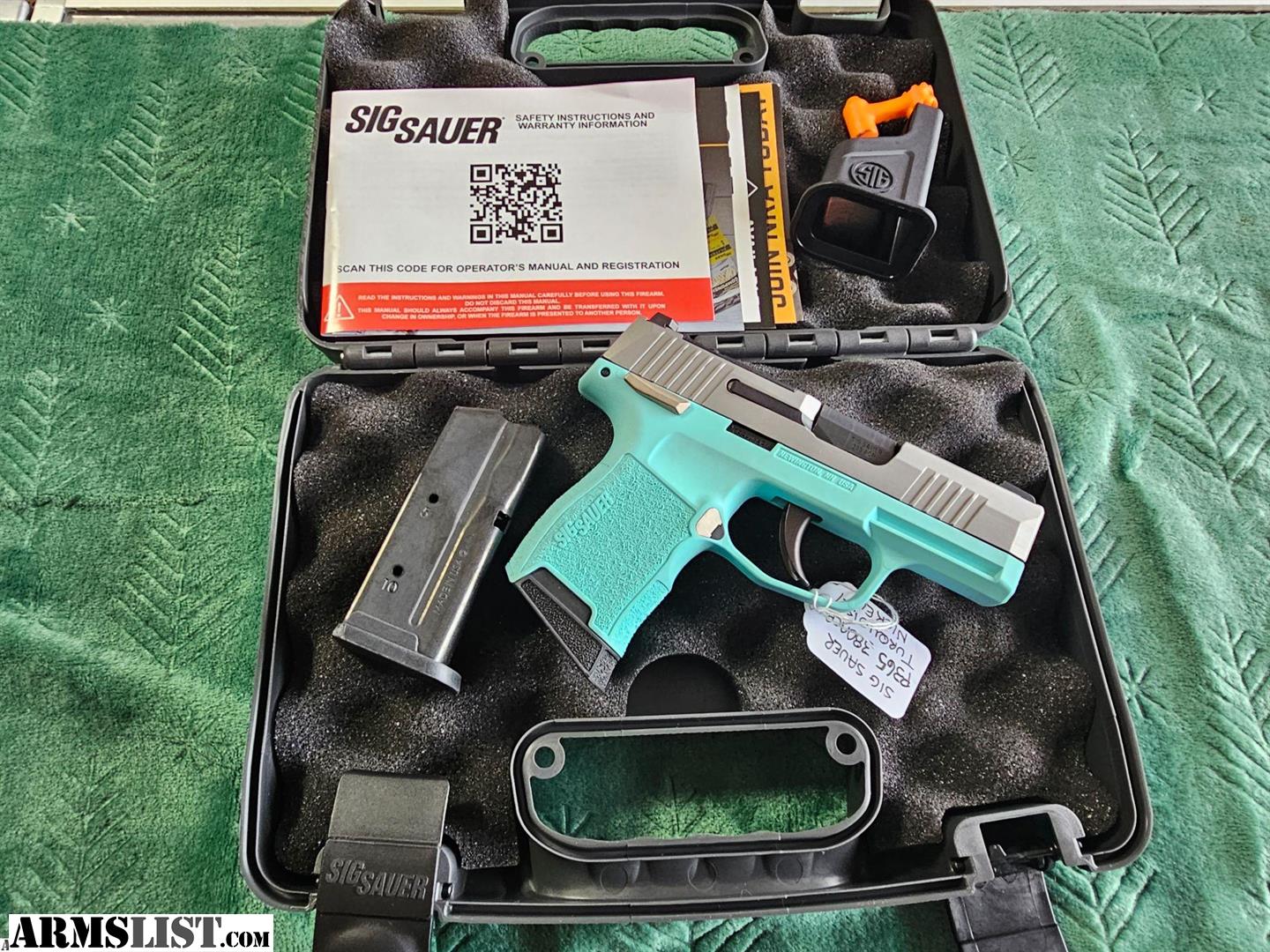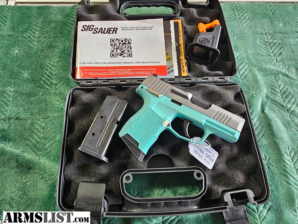 New Sig Sauer P365 chambered in .380. Beautiful robin's egg blue and stainless steel. Optics cut and ready. Manual safety.
