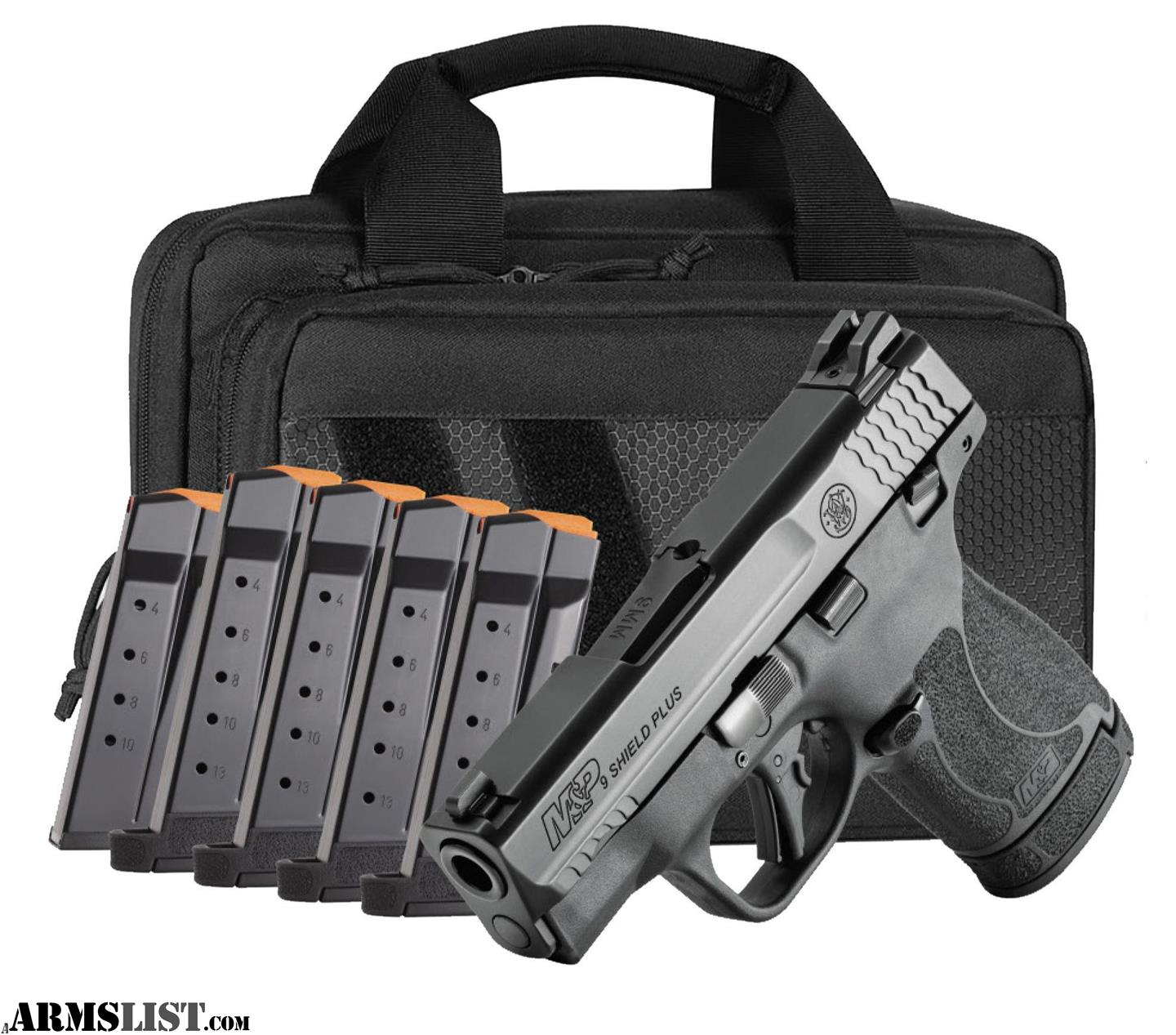 MANUFACTURER: Smith and Wesson FAMILY: M&P Series MODEL: M&P9 Shield Plus TYPE: Semi-Auto Pistol ITEM GROUP: Centerfire Polymer Pistols ACTION: Striker Fired CALIBER/GAUGE: 9mm SLIDE: Stainless Steel FINISH: Black Armornite FINISH TYPE: Applied Finish FRAME: Polymer Frame STOCK/GRIPS: Black Polymer BARREL: 3.1" OVERALL LENGTH: 6.1" RATE-OF-TWIST: 1-in-10 CAPACITY: 13 + 1 # OF MAGAZINES: 6 MAG DESCRIPTION: One 10 rd. & 5-13 rd. SIGHTS: Fixed White Dot SIGHT TYPE: Fixed Sights WEIGHT: 20.2 oz. SHIPPING WEIGHT: 6.55 lbs. SAFETY FEATURES: Single-Sided Thumb Safety CASE: Savior Specialist Bag ADDL INFO: Flat Face Trigger ADDL INFO: Enhanced Grip Texture MFG MODEL NO: 14750 UPC: 022188905250