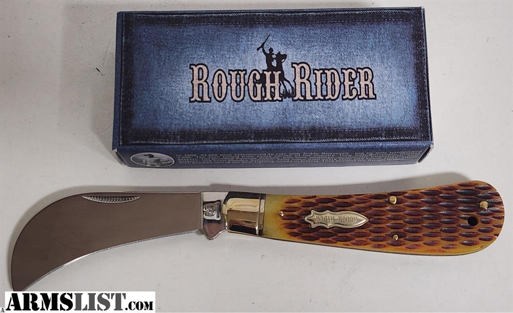 Rough Rider Knives Hawkbill Amber Bone. 4" closed. 440 stainless hawkbill blade. Amber jigged bone handle. Nickel silver bolster(s). Inlay shield. Boxed.