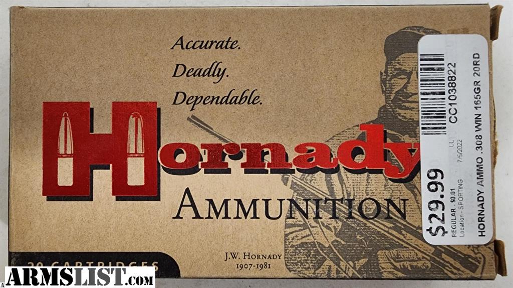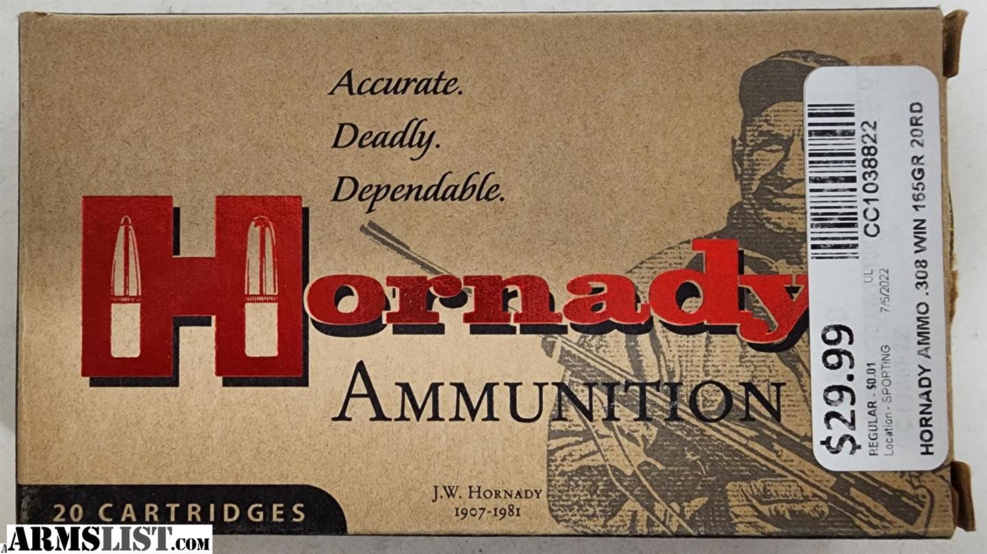 Hornady Custom 308 Winchester Ammo 165 Grain Hornady Interlock Jacketed Soft Point Box of 20