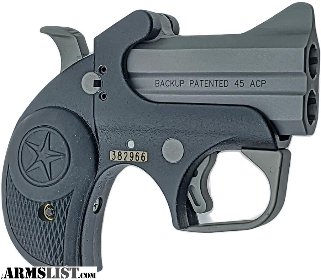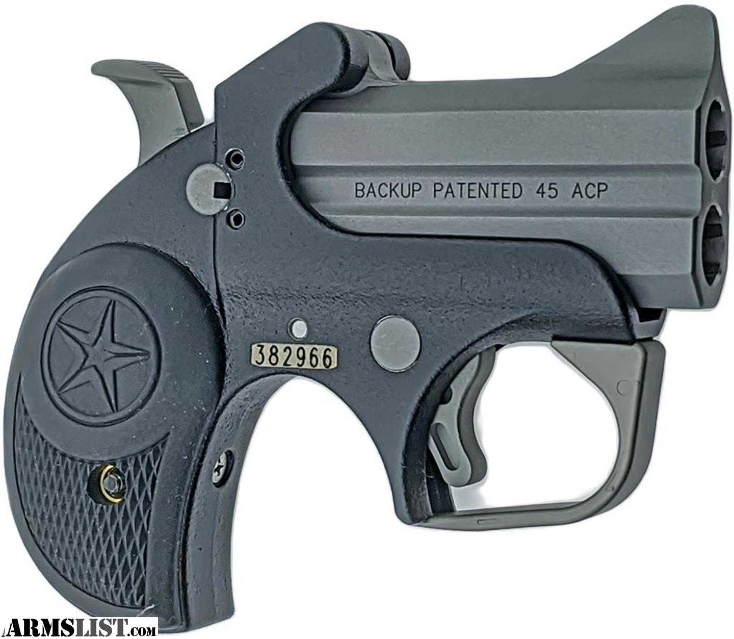 Brand: Bond Arms Model #: BABU Caliber: .45ACP Barrel Length: 2.50" Grip Material: Rubber Sights: Front blade, fixed rear Trigger Guard: Yes Designed for easy concealment when you need it, our Backup features a textured frame and bead-blasted anti-glare barrel designed to fire powerful .45 ACP or 9MM rounds with its 2.5″ barrel.