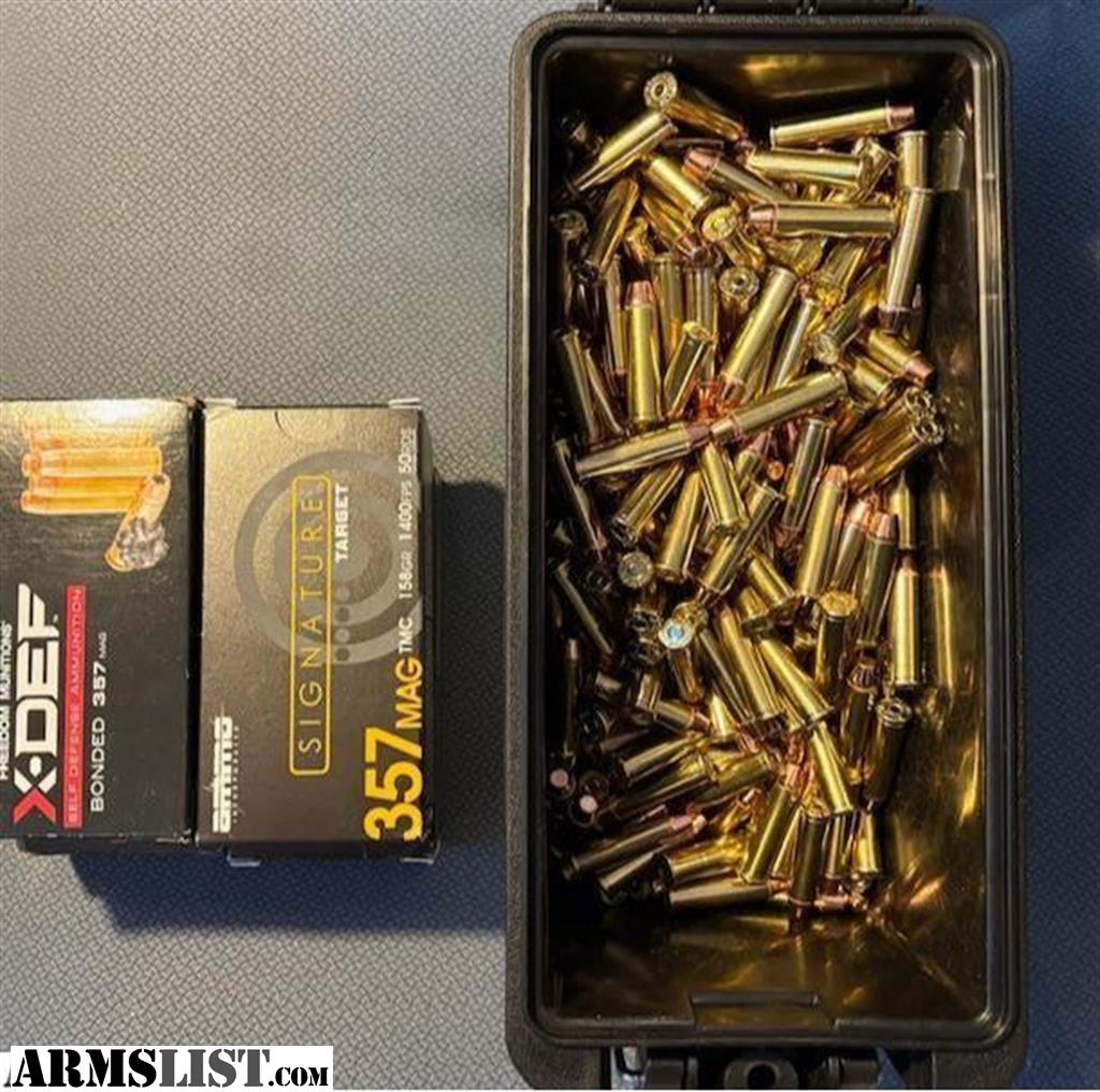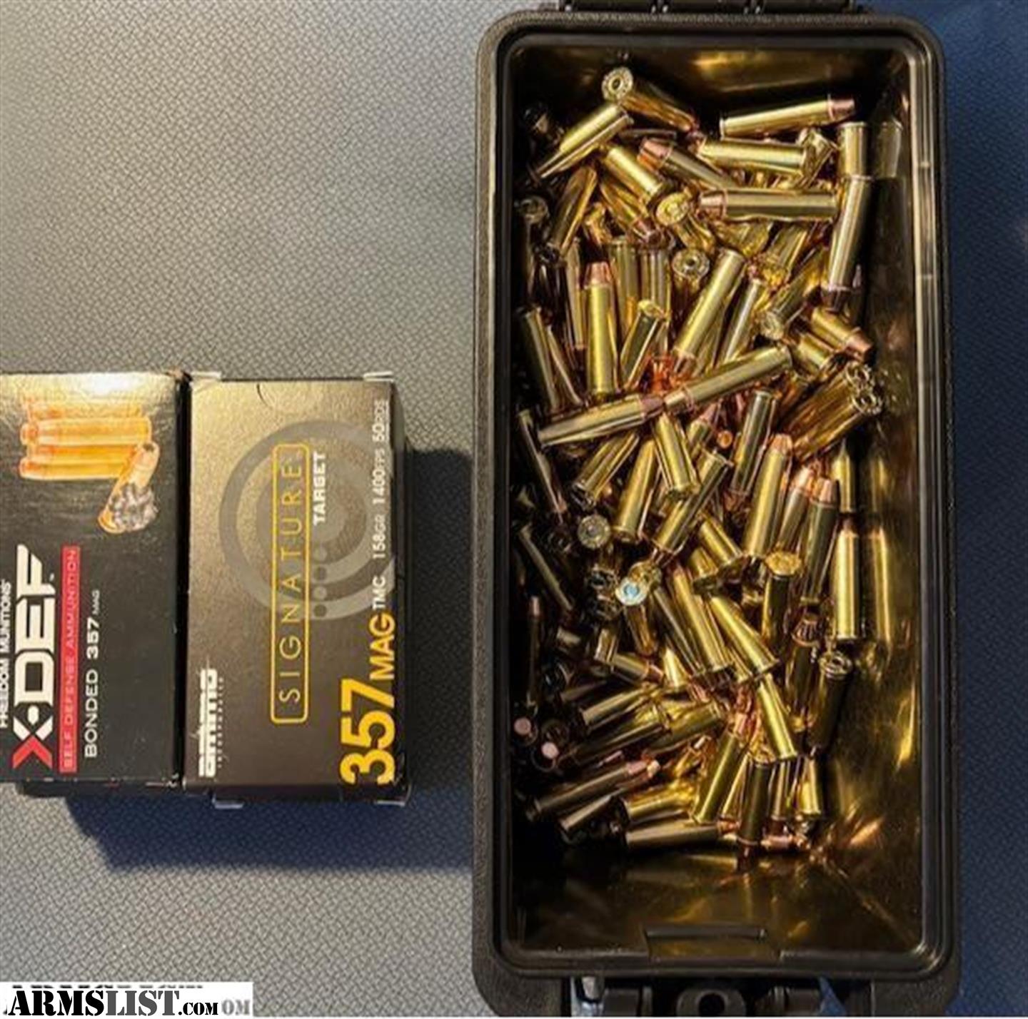 2 boxes of 50 reedom X-DEF Defense 357 Mag 125 gr Hollow Point $25 each 2 boxes of 50 Ammo Inc Signature .357 Magnum 158 gr TMC $25 each 500 rounds in plastic ammo can all factory ammo LAX Ammunition 357 Mag 158 gr Flat Point $190