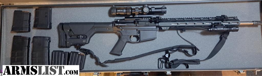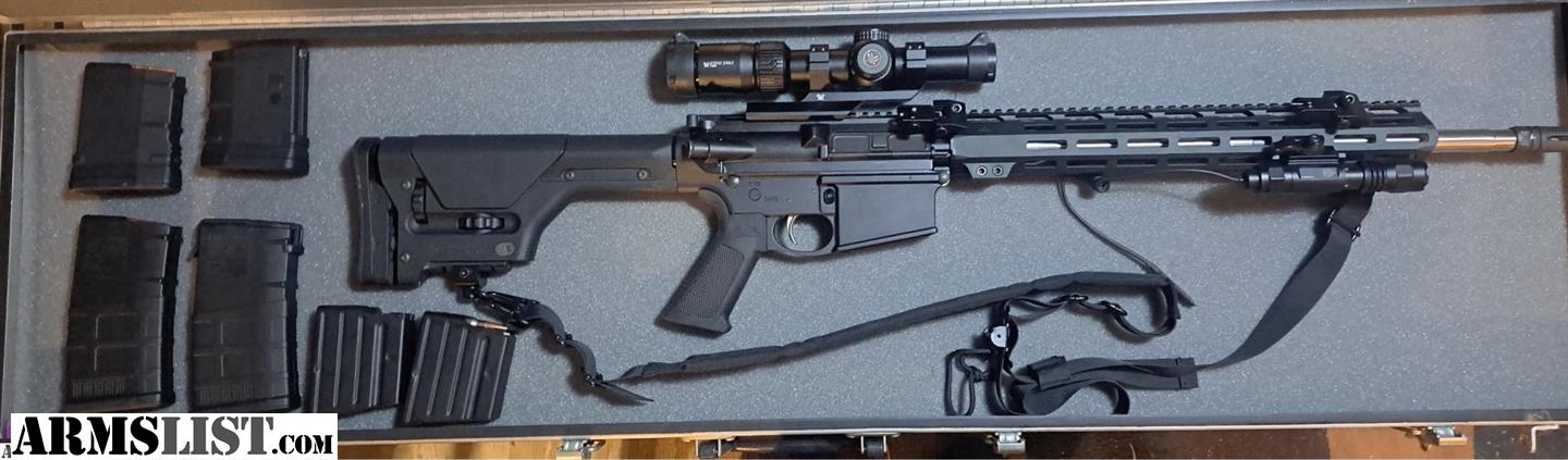 Very nice Very accurate AR10 20" stainless 1/10 twist with Vortex strike eagle 1x8x24 lighted reticle with flip up caps and Vortex cantleaver scope mount. Magpul PRS gen 2 stock plus original stock. UTG light ELPE380-A. 45° angle flip up sights. ICC locking aluminum carry case. Two 5 round steel Duramag. Two 10 round Magpul and two 20 round Magpul mags. $1.500 to 17 value
