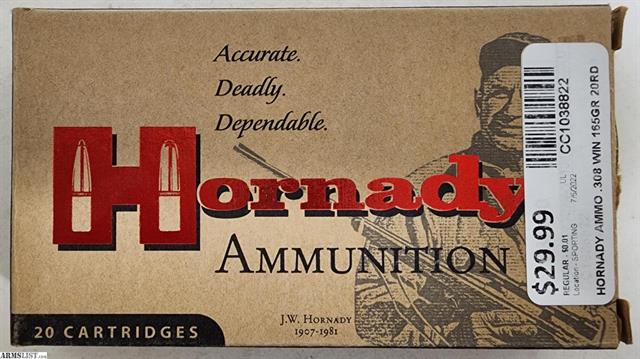 Hornady Custom 308 Winchester Ammo 165 Grain Hornady Interlock Jacketed Soft Point Box of 20